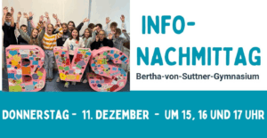 Unser Info-Nachmittag bietet an der Anmeldung interessierten Schülerinnen und Schülern sowie deren Eltern die Möglichkeit, das Bertha-von-Suttner-Gymnasium kennenzulernen und ins Gespräch mit den Lehrkräften zu kommen. Weitere Informationen zu den...