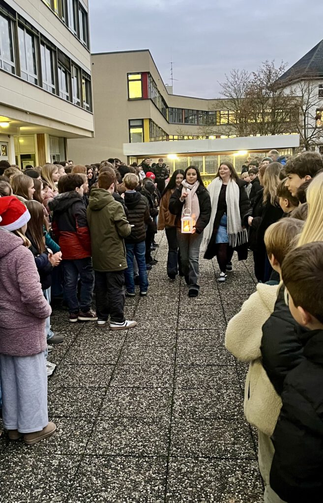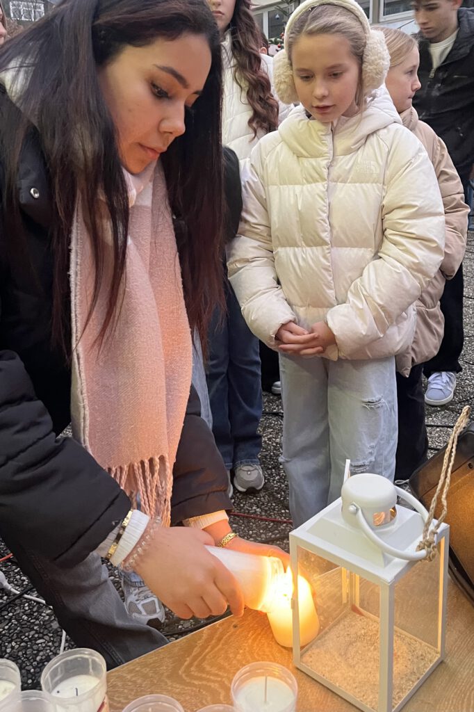 Nach dem gemeinsamen Singen der Weihnachtslieder, die vom Musikkurs der Jahrgangsstufe 12 und Mitgliedern der Schulband begleitet wurden, sprachen die Schülersprecherinnen des BvSG Ceylan Basoda, Hazal Sirince und Amalia Arribanca mit Blick auf das Licht von der Ermutigung zu Frieden, Hoffnung und Gemeinschaft, und dies fordere im Umgang miteinander zu Respekt, Zusammenhalt und Füreinander-Da-zu-sein auf. So sollten alle am BvSG Verantwortung übernehmen, dass sich alle Menschen an der Schule wohl und sicher fühlen können. Im Anschluss verteilten sie das Friedenslicht an die Klassen- und Kurssprecher:innen, die es schließlich in ihre noch dunklen Klassenräume trugen – in Verbindung mit den Menschen im Nahen Osten und allen Menschen weltweit in ihrer Hoffnung auf Frieden.